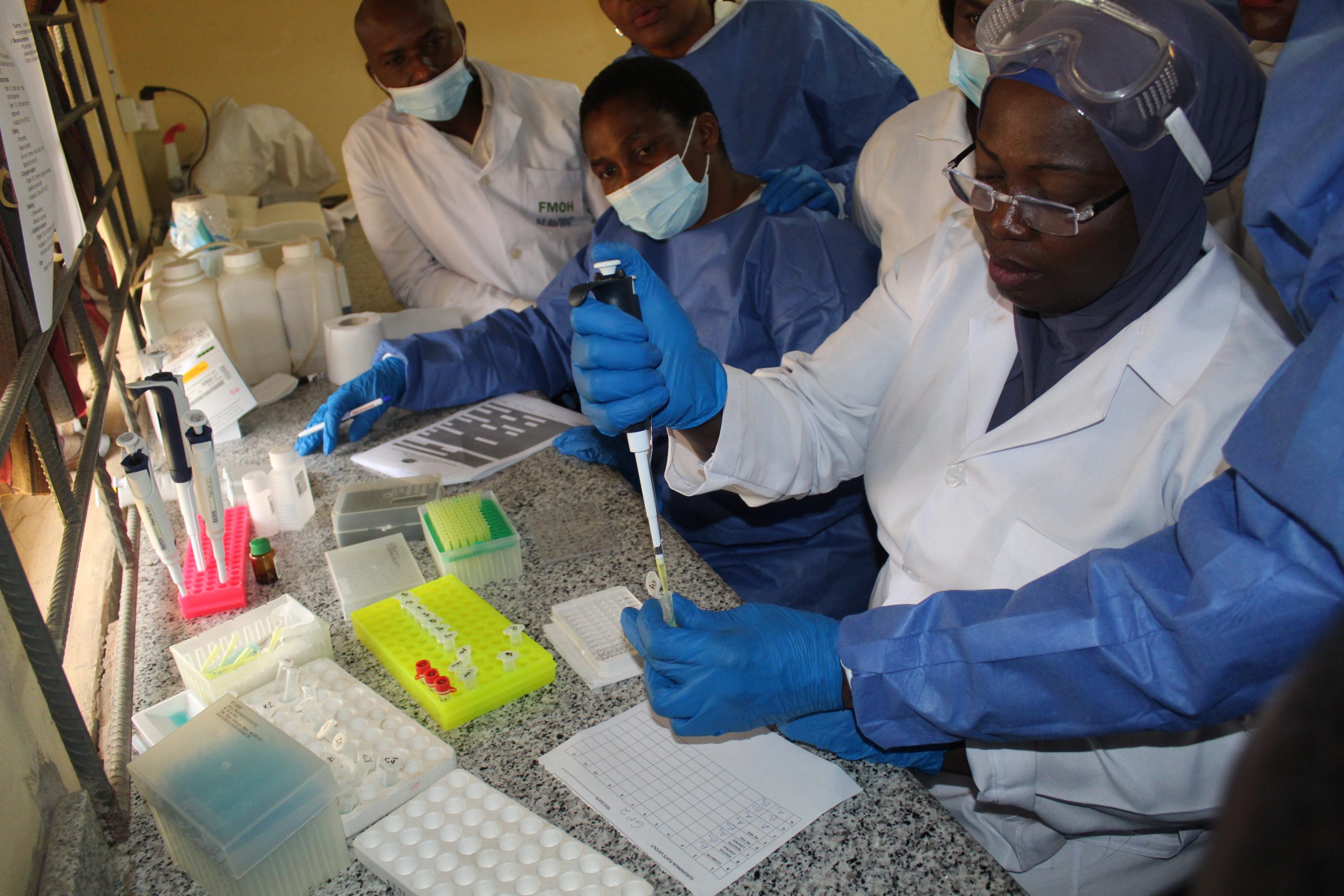 The Head Molecular Biology Section Mrs. Okesade carrying out practicals on pipetting during the training
