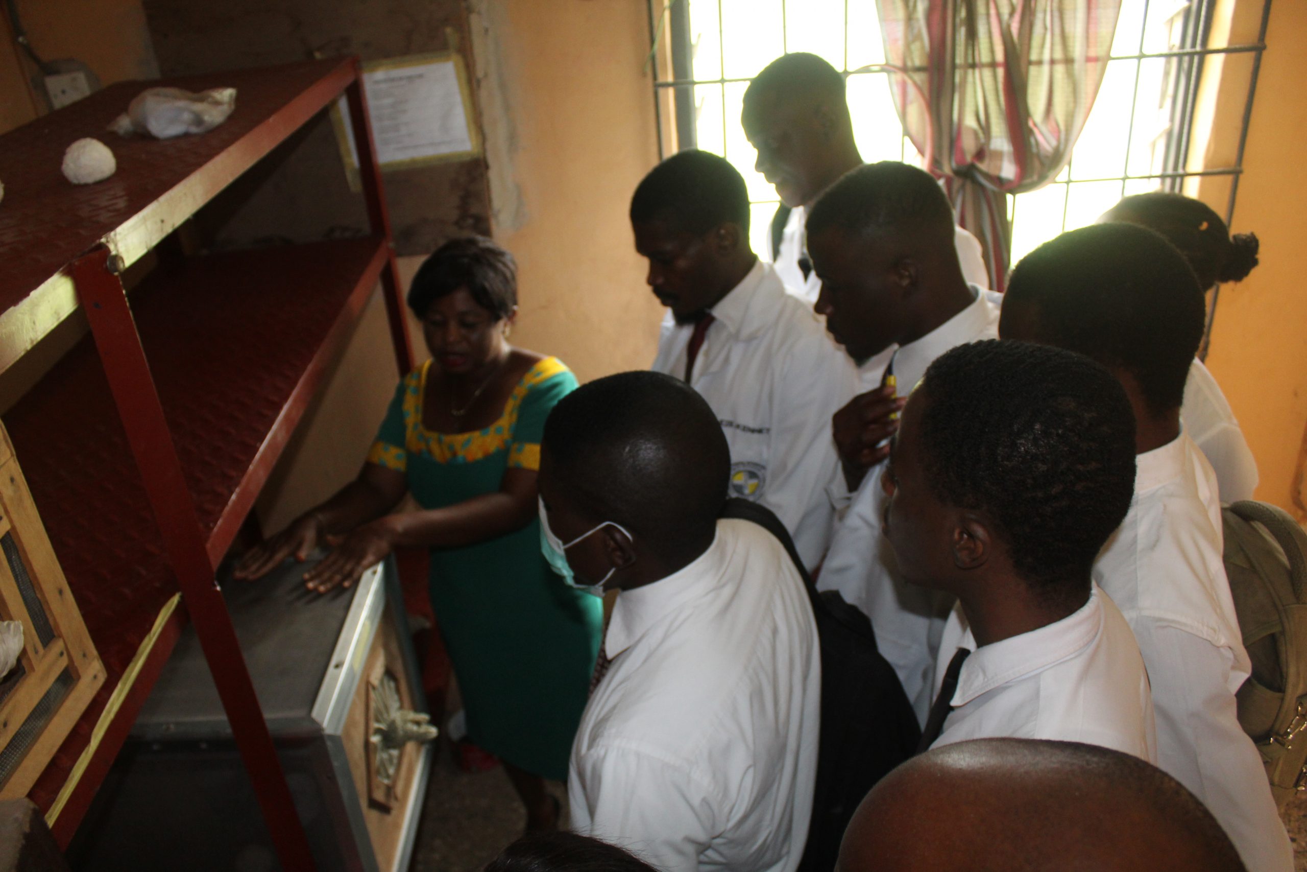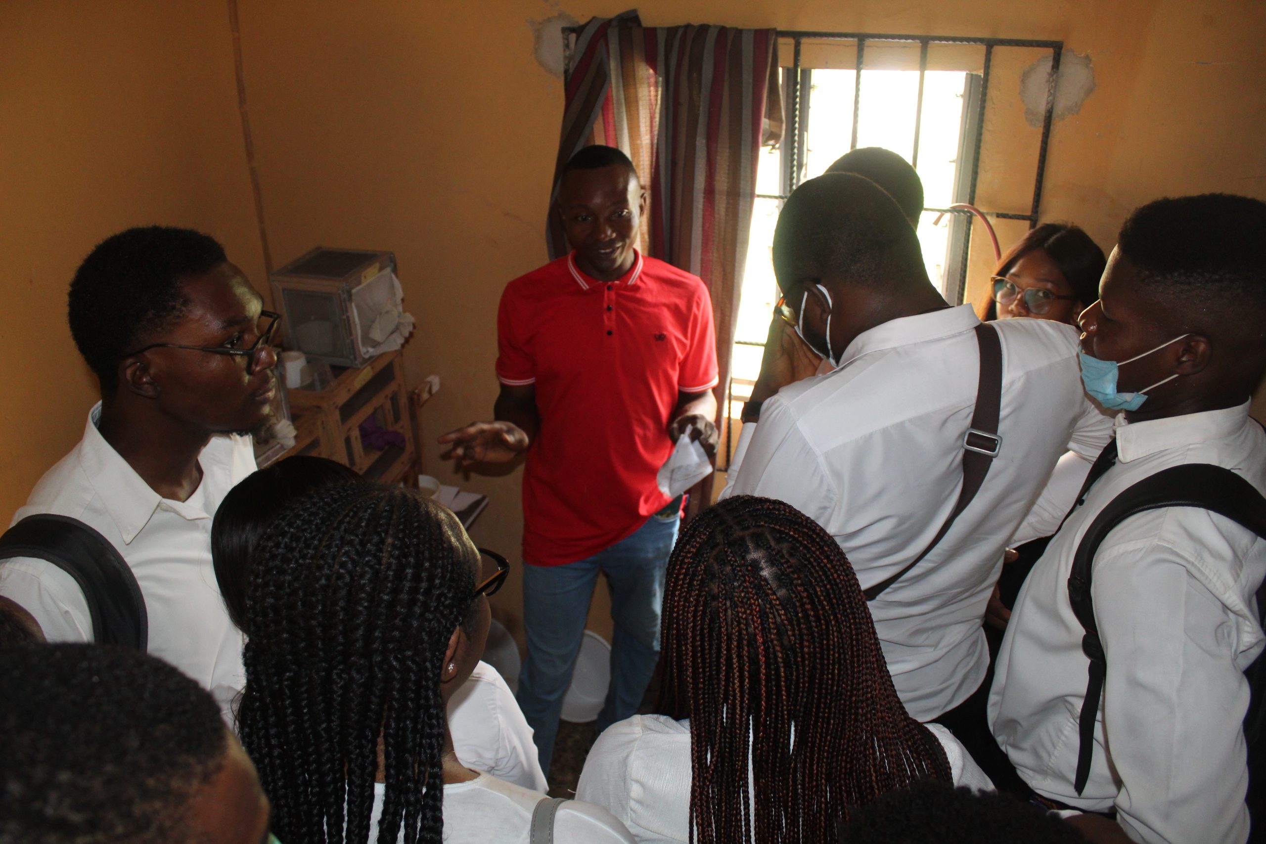 Ms. Ikechukwu carrying out explanations of  the Insectary for a better understanding of the different mosquito and  colonies by the students